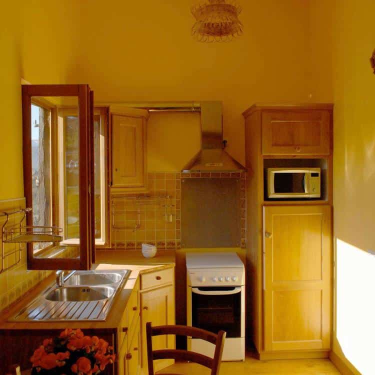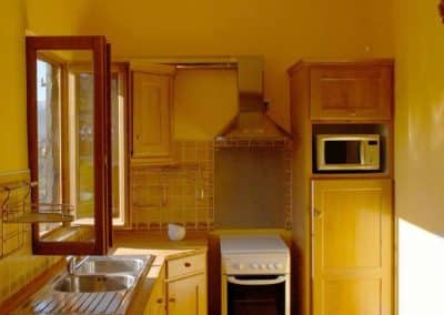 - 1 cuisine équipée (évier, micro-ondes, cuisinière à gaz, frigo, divers placards, poubelles de tri sélectif)